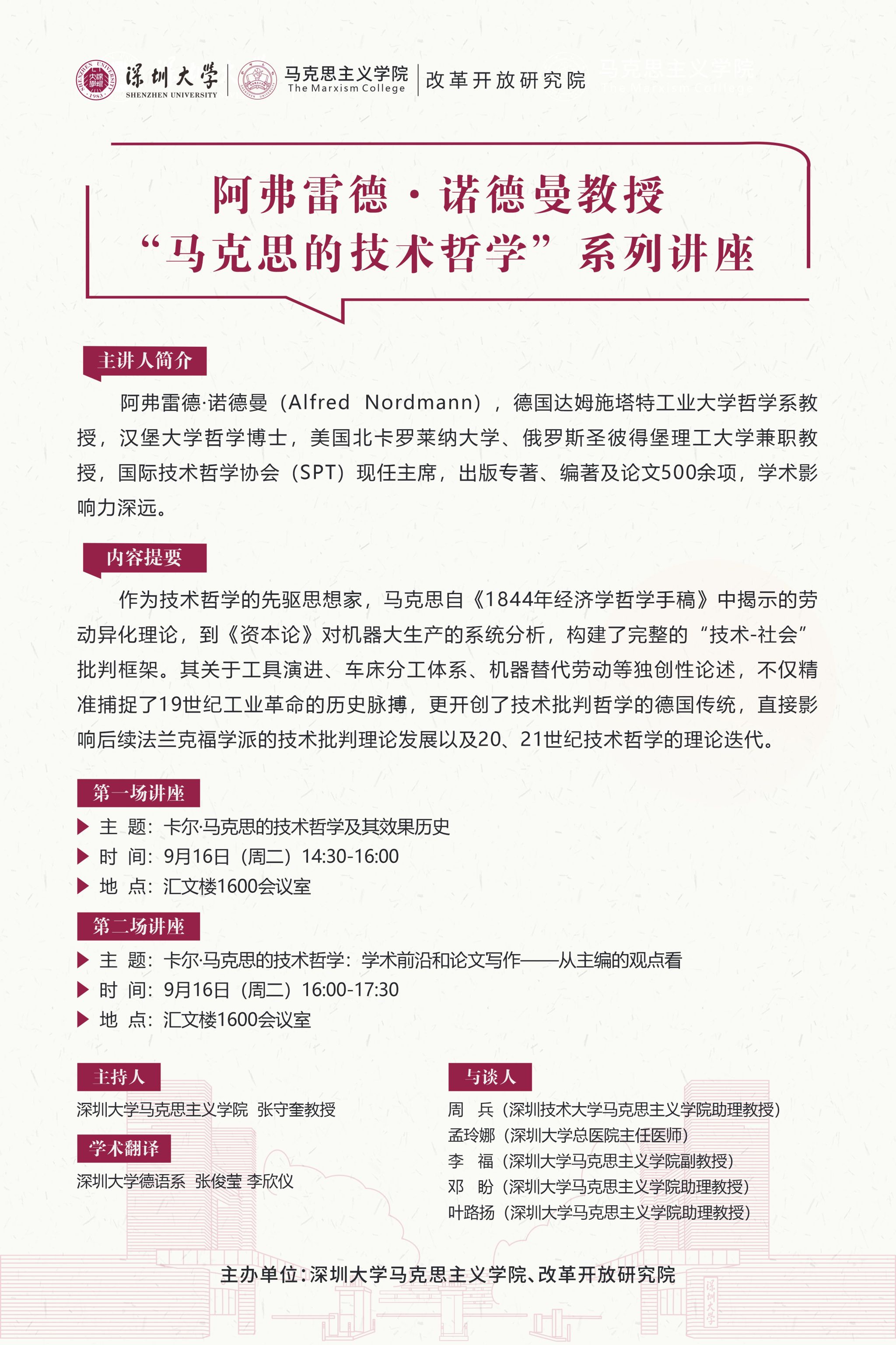 主讲人简介:阿弗雷德·诺德曼(Alfred Nordmann),德国达姆施塔特工业大学哲学系教授,汉堡大学哲学博士,美国北卡罗莱纳大学、俄罗斯圣彼得堡理工大学兼职教授,国际技术哲学协会(SPT)现任主席,出版专著、编著及论文500余项,学术影响力深远。